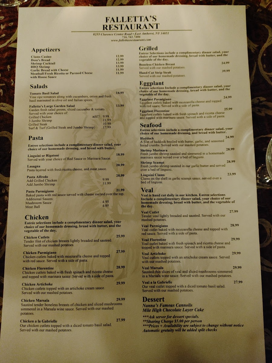 Welcome to Falletta's, nestled in the heart of East Amherst, NY. This charming restaurant is much more than just a dining spot; it’s a community favorite, celebrated for its exceptional food and warm hospitality. Offering a diverse menu, Falletta's boasts everything from mouthwatering strip steaks to delectable garlic bread, all prepared with a commitment to quality and flavor.